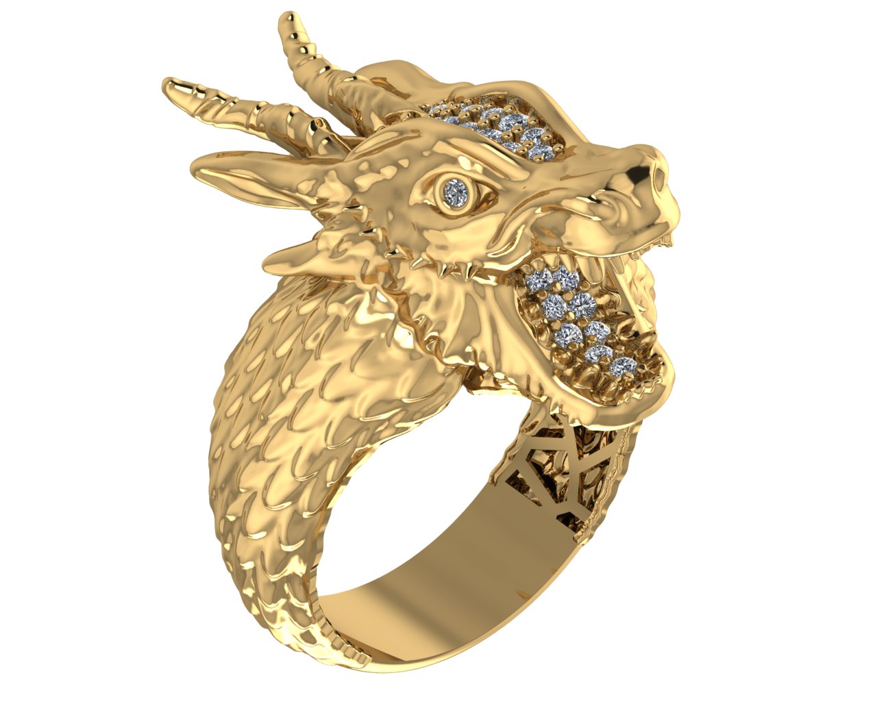 Exceptional Sculpted Details: The dragon's head features a high level of intricate detail, including a textured neck, sharp teeth, and detailed horns. The pave settings on the head and inside the mouth are also part of the sculpted mesh.